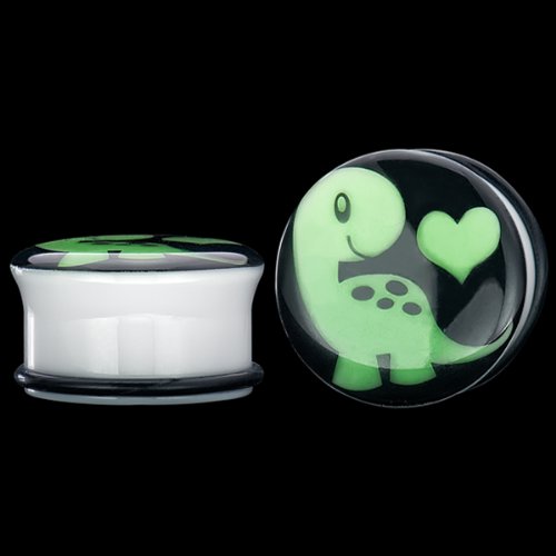 This single flared glow in the dark plug proves dinosaurs never go extinct. The adorable dinosaur and heart contrast amazingly against the high gloss, black background making a colorful plug that's fun to wear. Naturally lightweight and non-porous, acrylic also provides the plug with easy wearability and cleaning. The plug's O-ring ensures a comfortable, secure fit and no trouble putting it on or taking it off. Read more customer reviews ...